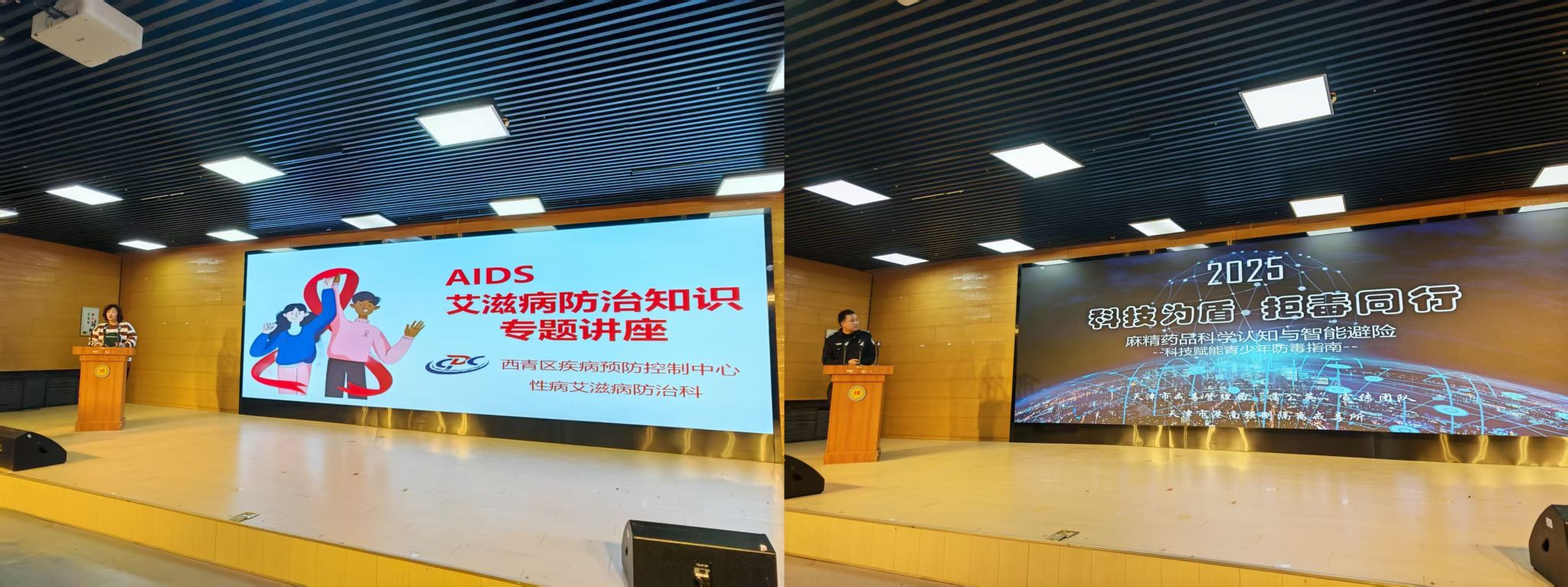 12月1日,我校特邀西青区疾病预防控制中心的刘楠老师、西青区禁毒办的张斌老师到校开展专题讲座。本次讲座旨在普及艾滋病防治知识,全面提升大学生群体对艾滋病的认知水平、自我防范能力与社会包容意识。刘楠老师结合最新疫情数据,系统解读艾滋病传播路径、科学防护措施等,帮助同学们建立科学防护意识;张斌老师则从法治宣传、社会治理的角度切入,深入剖析禁毒与防艾的内在关联,带来实用的防护指引。
